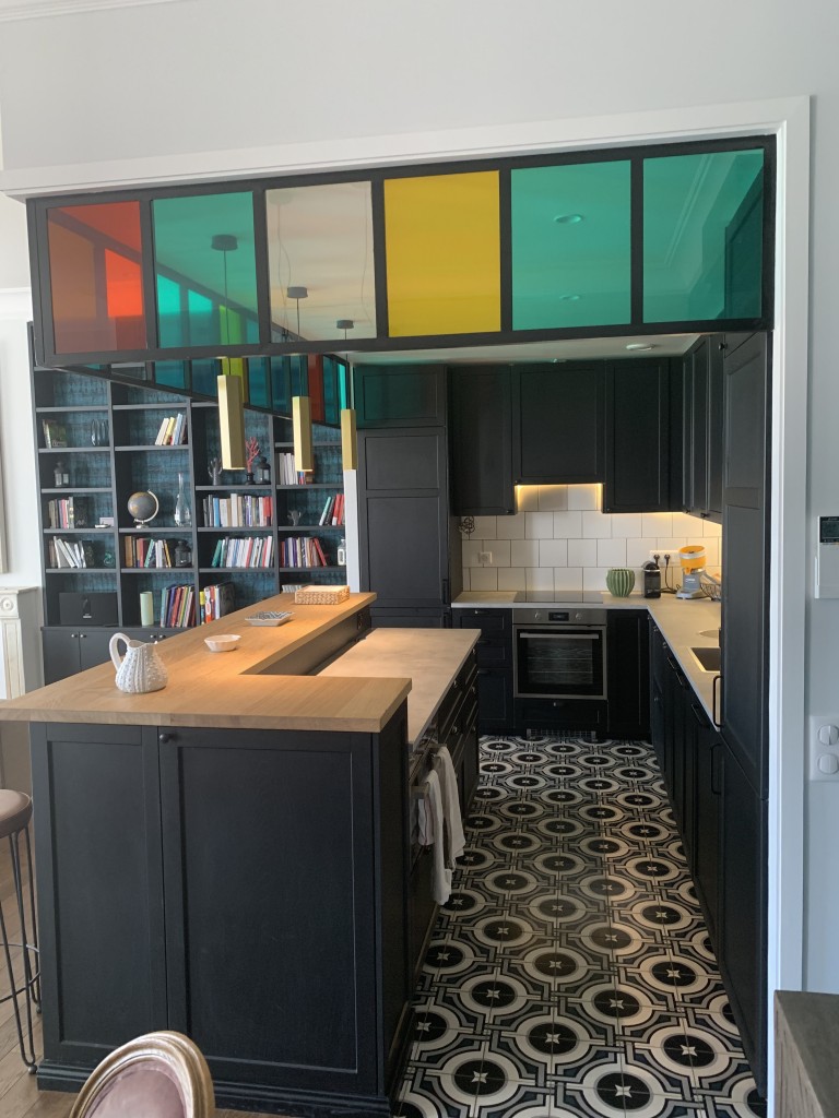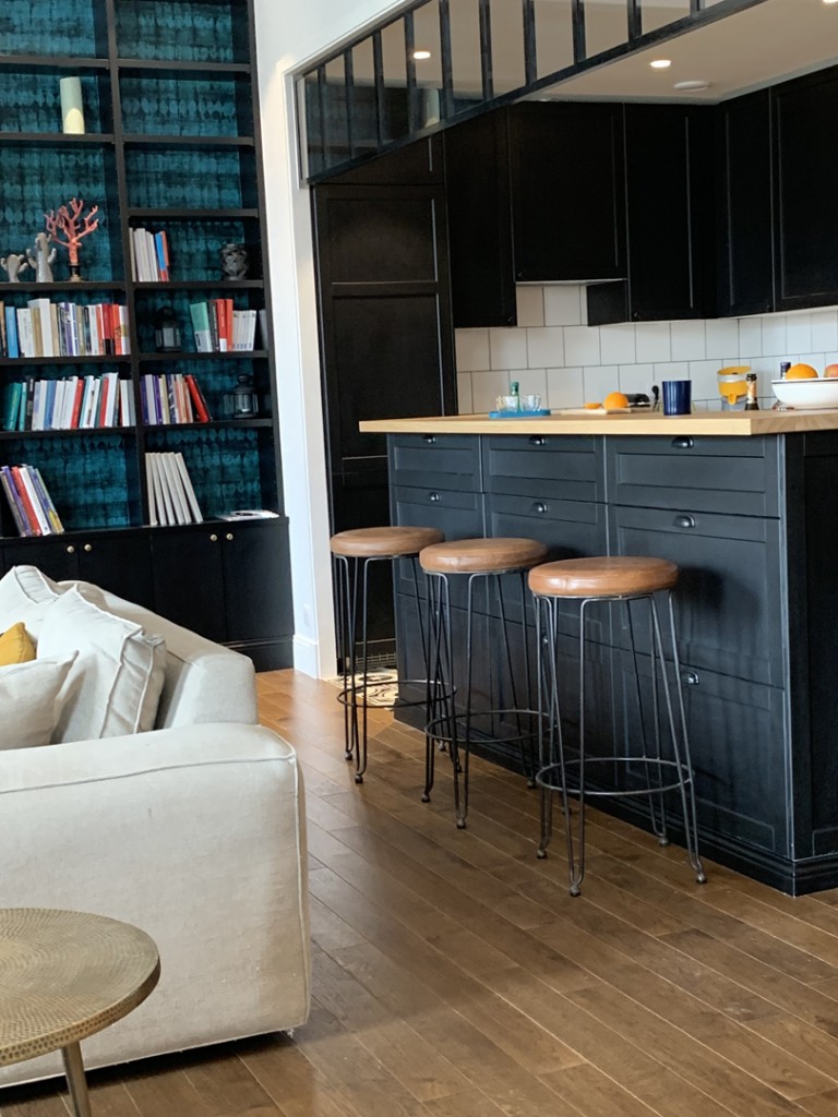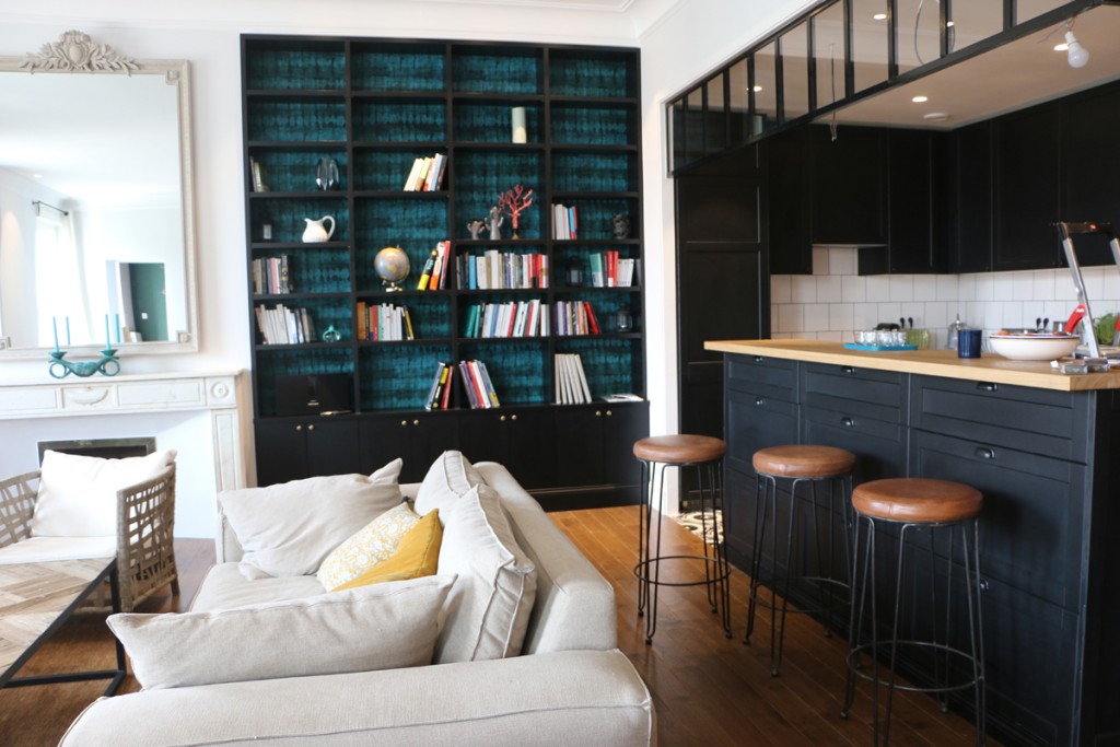 vaste pièce à vivre avec cuisine totalement équipée ouverte, espace repas et salon-tv, vue sur le canal